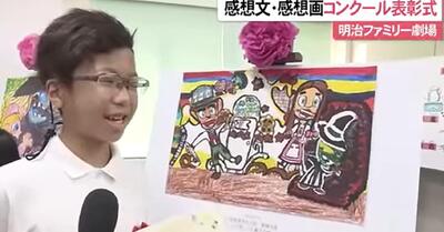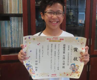 明治ファミリー劇場のミュージカルを鑑賞して感じたことを表現した感想文・感想画の表彰式がありました。163点の応募の中から5人の最優秀賞:感想画小学校高学年の部に南風原小学校 「大渕斗梁」さんが表彰されました。おめでとうございます。