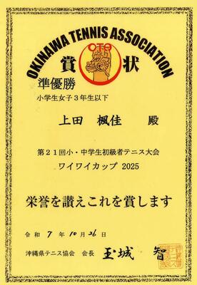 10/26(日)第21回小・中学生初級者テニス大会 ワイワイカップ2025において 小学生女子3年生以下「準優勝」の成績を収めたという嬉しい報告がありました。 上田楓佳さん おめでとうございます。