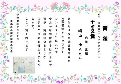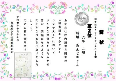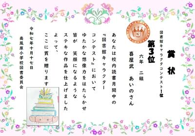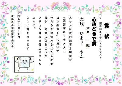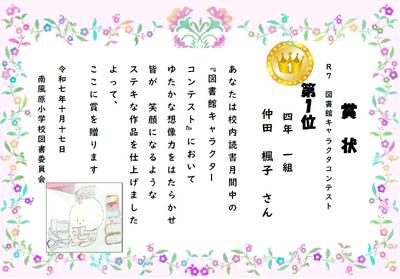 校内読書月間中の「図書館キャラクターコンテスト」において、豊かな想像力を働かせ皆が笑顔になるような作品として入賞しています。 入賞したみなさん おめでとうございます。