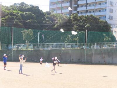 1月14日(水) 2校時~4校時 1年生のみんさんが「手作りのたこ」を広い運動場で高く高くたこあげをしました。