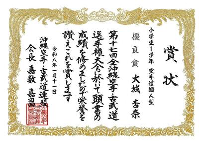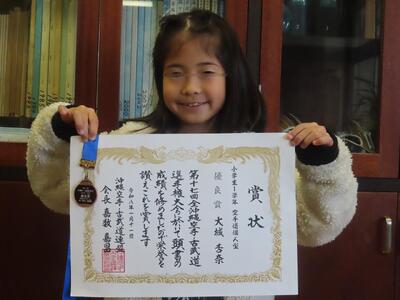 1月11日(日) 第17回全沖縄空手・古武道選手権大会:空手道個人型において、1年:大城杏奈さんが「優良賞」の成績を収めたという嬉しい報告がありました。おめでとうございます。