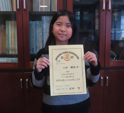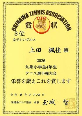 2026九州小学生4年生テニス選手権大会;女子シングルスにおいて、3年:上田楓佳さんが「沖縄県予選・第3位」の成績を収め、5月に大分県で行われる九州大会へ出場するという嬉しい報告がありました。おめでとうございます。