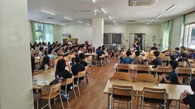 1日目の昼ご飯 玉城青少年の家の食堂で班ごとに座っていただきました。