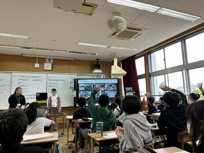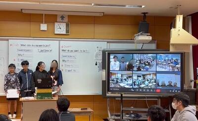 3月6日(木) 南風原小学校の6年生と北丘小学校の6年生が、電子黒板を活用してのオンラインによる英語授業交流を実施しました。4月からは、ほとんどの子ども達が南風原中学校で一緒に授業をすることになりますね。