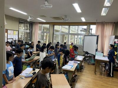 その後、亡くなった方々が安らかに眠れるように,そして1日も早い復興を願い,東北地方の皆さんに元気になってもらえるように,南風原小全員で1分間の黙祷を捧げました。