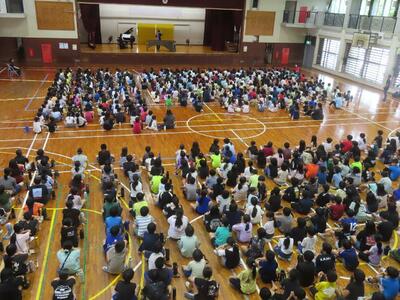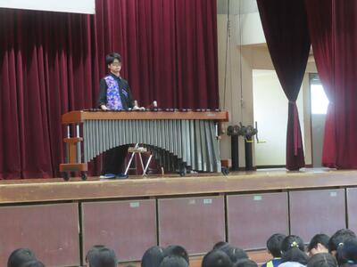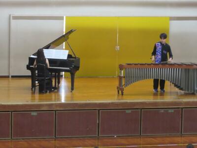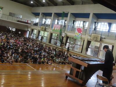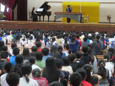 5月23日(金)1校時 体育館で音楽朝会の拡大版として音楽鑑賞会を行いました。音楽専科:佐藤健詞郎先生のマリンバ演奏と島袋未咲さんのピアノ演奏による迫力ある生演奏を全児童で聞くことができました。①ディズニーメドレー、②もののけ姫より「アシタカとサン」、③犬のおまわりさん、④リベルタンゴ、⑤花は咲くの5曲を子ども達は観賞できました。