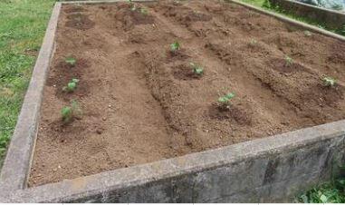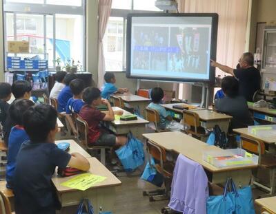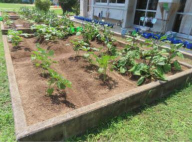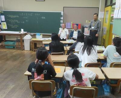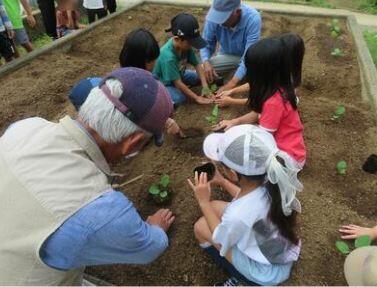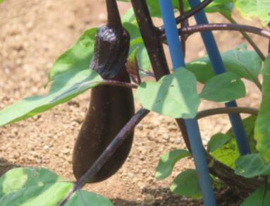 4月21日(月)2年生が校内の畑で「学校応援隊はえばる」の野菜名人さんの指導のもと、「ナス」「オクラ」の苗の植え付けをしました。2年生も水かけをがんばり、「ナス」は、みごとな実に成長しています。