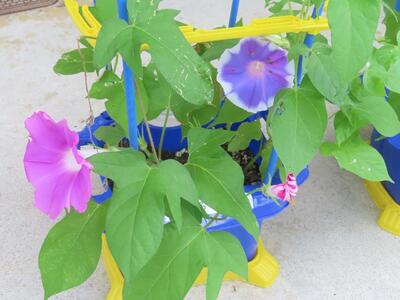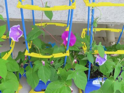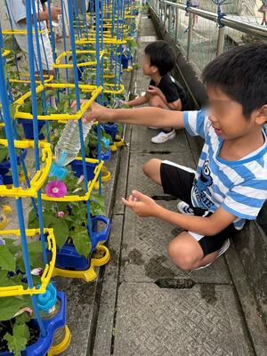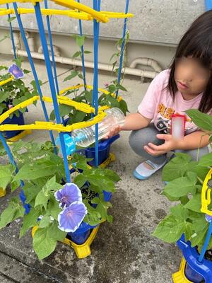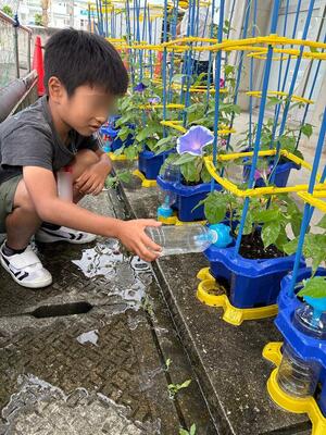 そのアサガオの花が咲きはじめています。 1年生も水かけを頑張っています。