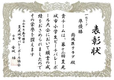 5月4日に第12回豊見城市小学生ビーチバレーボール大会において、一次リーグ「準優勝」の成績を収めたことの嬉しい報告がありました。南風原クラブ(バレーボール)の皆さん おめでとうございます。