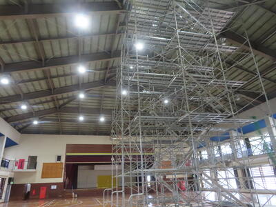 体育館のLED工事が順調に進んでいます。 大きな足場を組んでの作業です。 来週の「6年生を送る会」は新たなLEDの明るい中でできそうです。