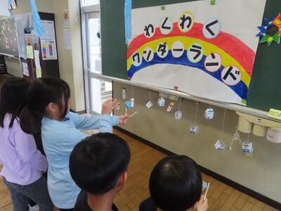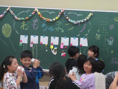 2月28日(金) 「おもちゃまつり」が2年生の各教室で開催しました。2年生が様々な手作りおもちゃを工夫して作り、1年生を教室に迎えて、一緒におもちゃで遊びました。 1年生は大喜び! 2年生もお兄さん・お姉さん気分で楽しいひとときをすごしました。