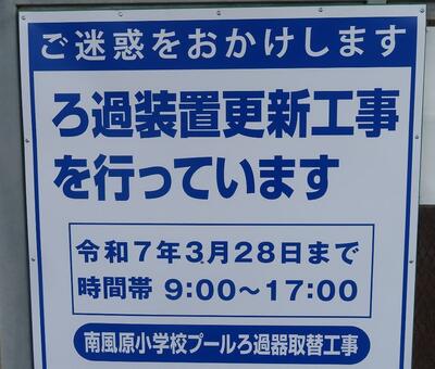 本年度は水泳学習の直前に「ろ過装置」が故障して、子ども達にも充分な水泳学習ができない状況になり、申し訳ありませんでした。 3月に新たなろ過装置の設置作業が行われます。 その第1段階として、ろ過装置設置のための足場を設置しております。クレーンでの設置作業は児童がいない土曜日、日曜日を予定していますので、その際はプール周辺での活動は遠慮願います。
