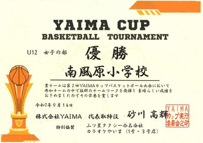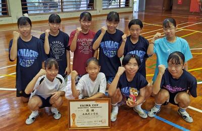 9月13日~14日に石垣島で行われた【YAIMAカップ】において、石垣島のチーム、本島内の強豪チーム、県外チームが参加する中で、南風原小女子ミニバスケットチームが見事『優勝』しました。 決勝戦は、残り7秒で逆転され1点差。必死に攻め、残り0.1秒。ファールを貰いフリースロー2本! プレッシャーの中2本のフリースローを決めて、大興奮の逆転優勝の成績を収め、大会MVPを勝井凛さんが獲得しましたという嬉しい報告がありました。