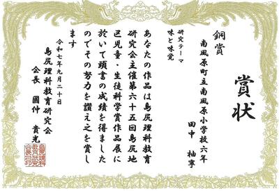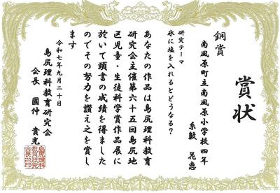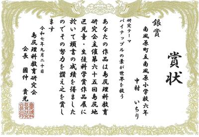 9月20日の島尻地区科学賞作品展において、「銀賞」 「銅賞」の成績を収めたという嬉しい報告がありました。夏休みに科学作品に関して時間と労力を費やして調査し、結果を追求した姿勢はとても素晴らしいものです。入賞したみなさん おめでとうございます。