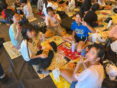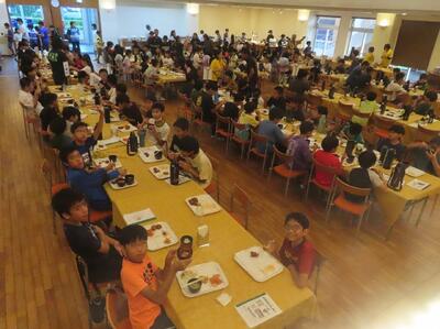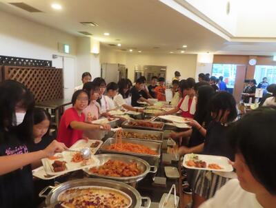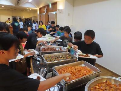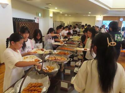 9月26日 修学旅行1日目の夕ご飯は「ホテル・バイキング」でした。 子ども達が好きな料理が並び、ほとんどの子がおかわりをしていました。 「明日の昼ご飯もカレーバイキングなんだよ! たのしみ!」と、うれしそうに話す子もいました。
