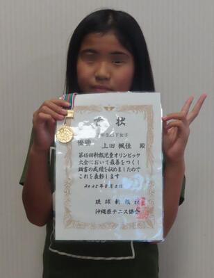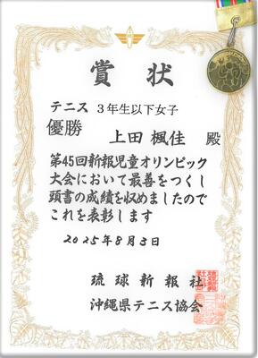 8月3日の第45回新報児童オリンピック大会のテニスの部において、「3年生以下女子」で南風原小学校3年生:上田楓佳さんが「優勝」の成績を収めたという嬉しい報告がありました。 おめでとうございます。