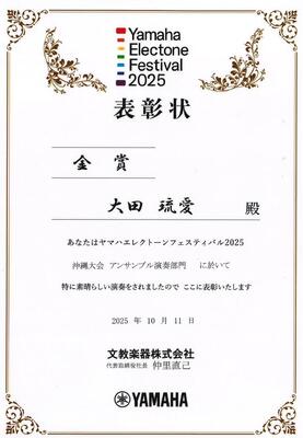 ヤマハエレクトーンフェスティバル2025 金賞 投稿: 校長 (13:44) 10月11日(土) ヤマハエレクトーンフェスティバル2025 沖縄大会:アンサンブル演奏部門において、4年:大田琉愛さんが「金賞」の成績を収めたという嬉しい報告がありました。おめでとうございます。