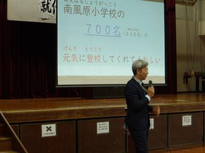 始業式では、校長講話として「心身の安全」「友だちのよさを見つける」ことを話しました。